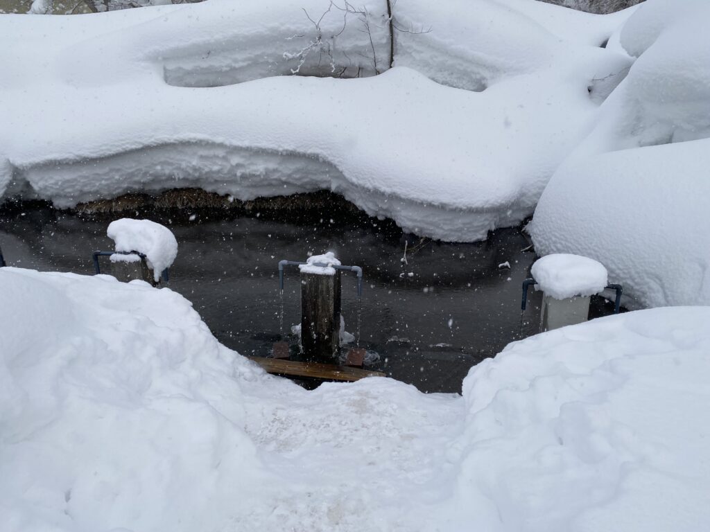 駐車場側から見ると、湧き水の手前に雪山ができていますが、それを乗り越えると、夏と同様水を組むことができます。
